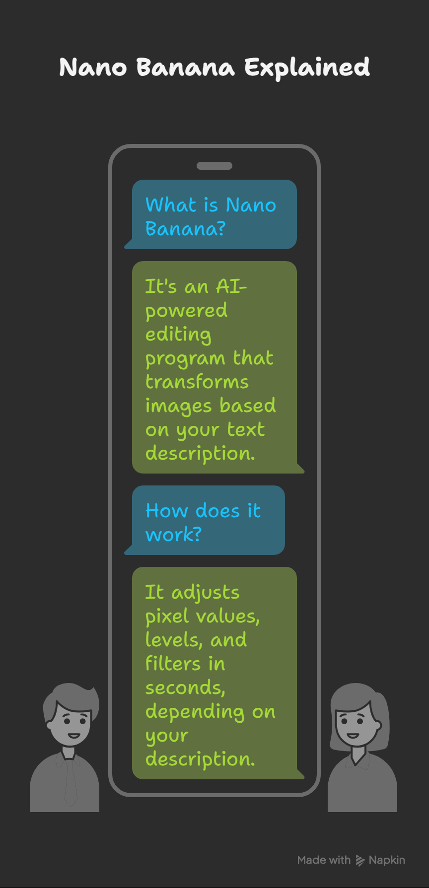 To put it in simple terms, Nano Banana is an AI-powered editing program that turns your images into other things, from text. Another way of saying it would be to describe the type of editing to be done: "Adjust pixel values, levels, filters, etc.," whereas Nano Banana would do it in seconds, depending on your description.